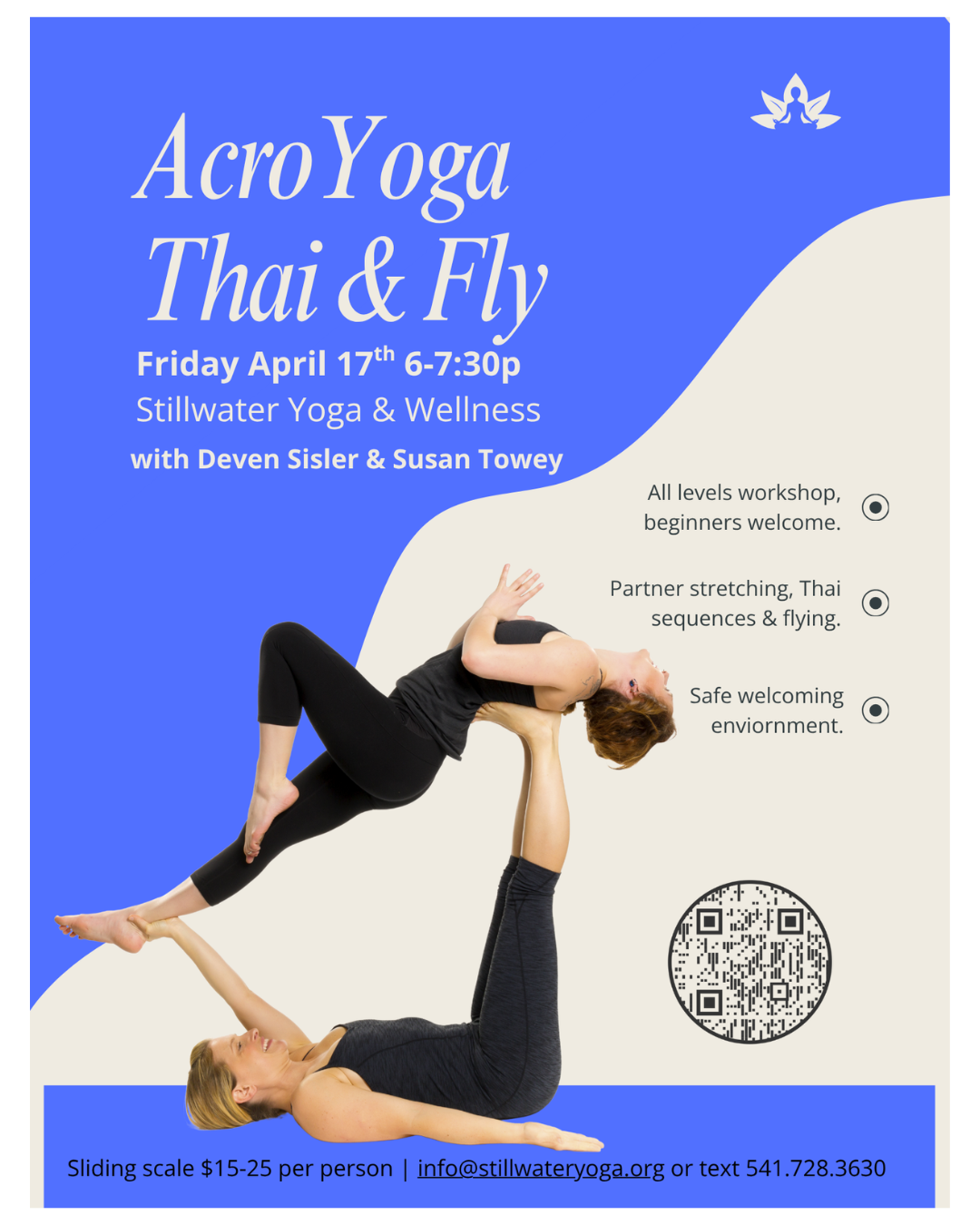 Join us for a supportive and uplifting experience designed for all levels, including beginners. We’ll explore partner-based stretching, Thai sequences, and simple, restorative AcroYoga poses—all in a safe, welcoming environment. This experience focuses on connection, relaxation, and building trust while learning something new.